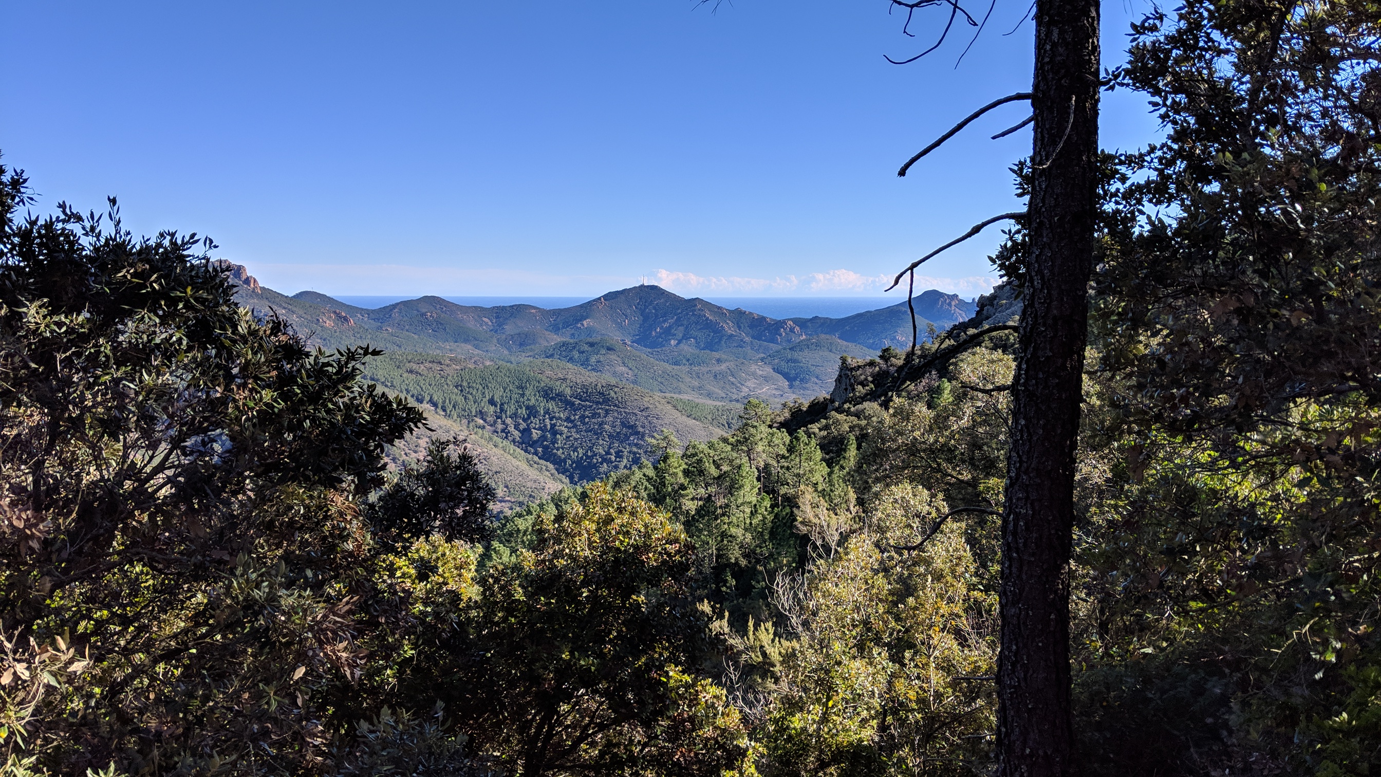 Programme de la randonnée n° 151: La route des cols autour du mont Vinaigre. Départ du col du Testanier, col de l’aire de l’olivier, maison forestière de la duchesse, mont Vinaigre, maison forestière du Malpey et retour au col du Testanier. Cette randonnée vous mènera au sommet du Mont Vinaigre, où vous pourrez voir la baie de Cannes et de Saint-Tropez. La randonnée est en grande partie à l’ombre des arbres du massif.