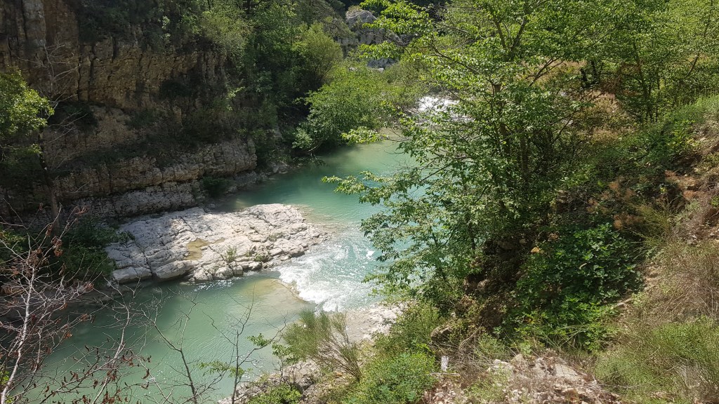 La balade commence en empruntant un sentier agréable qui fait quitter le village et descend vers une piste large et ensoleillée qui longe les eaux turquoise de l’Estéron.