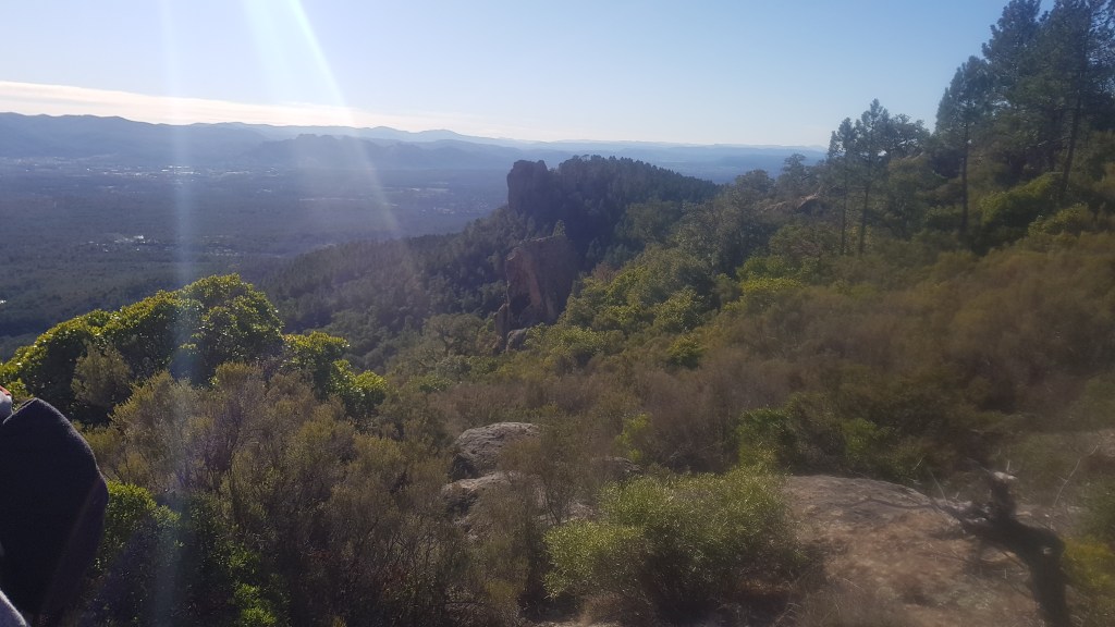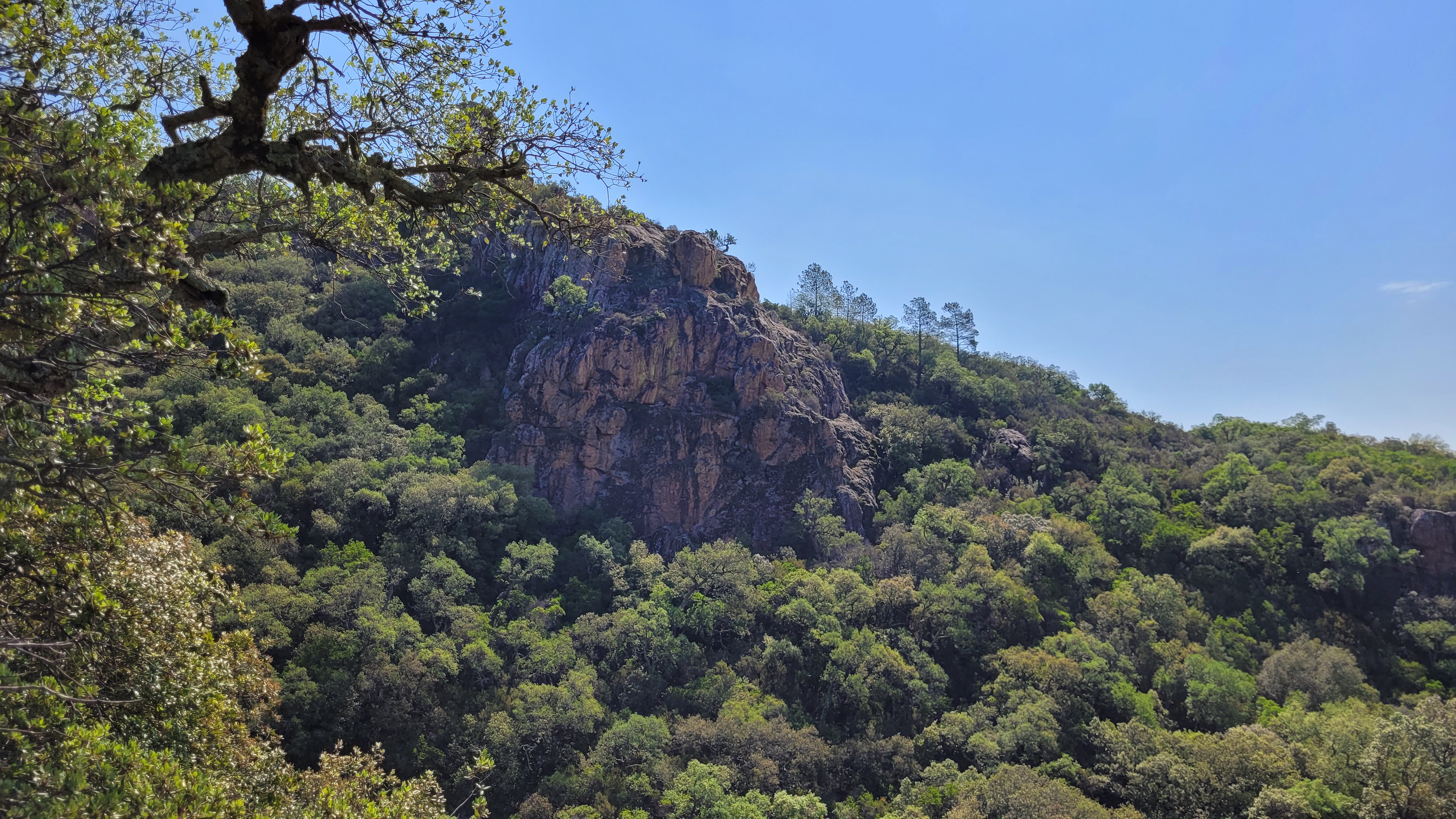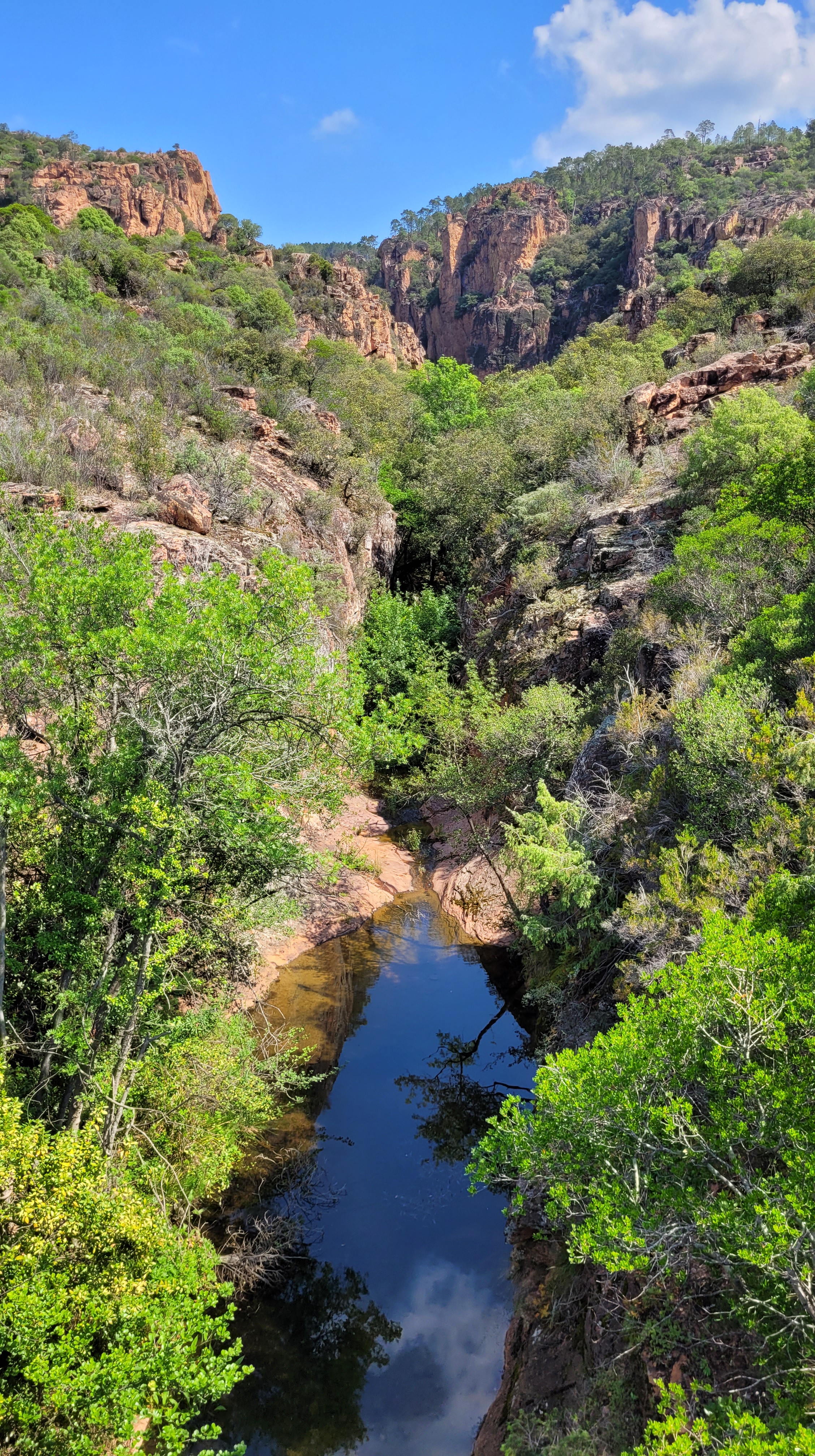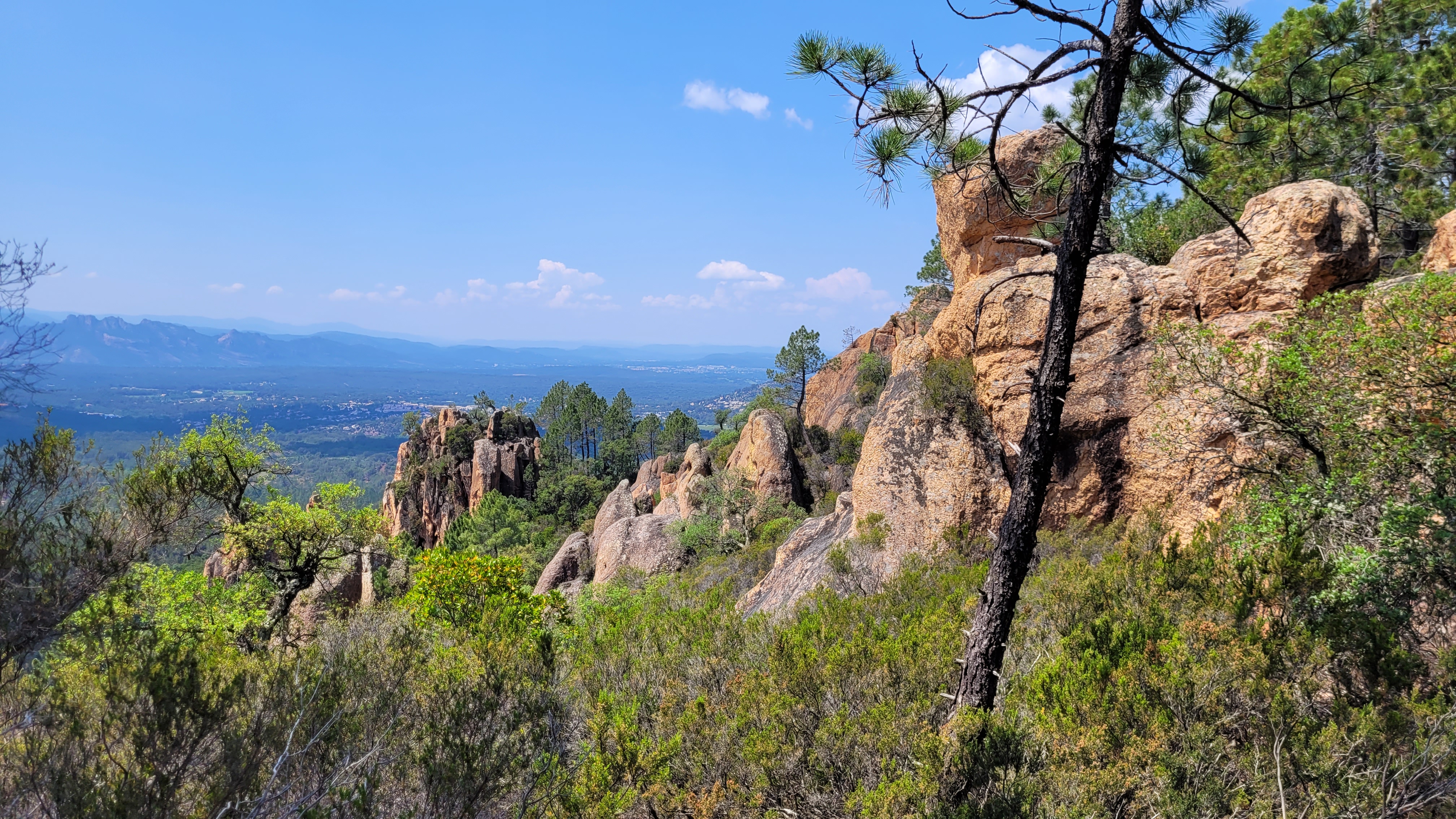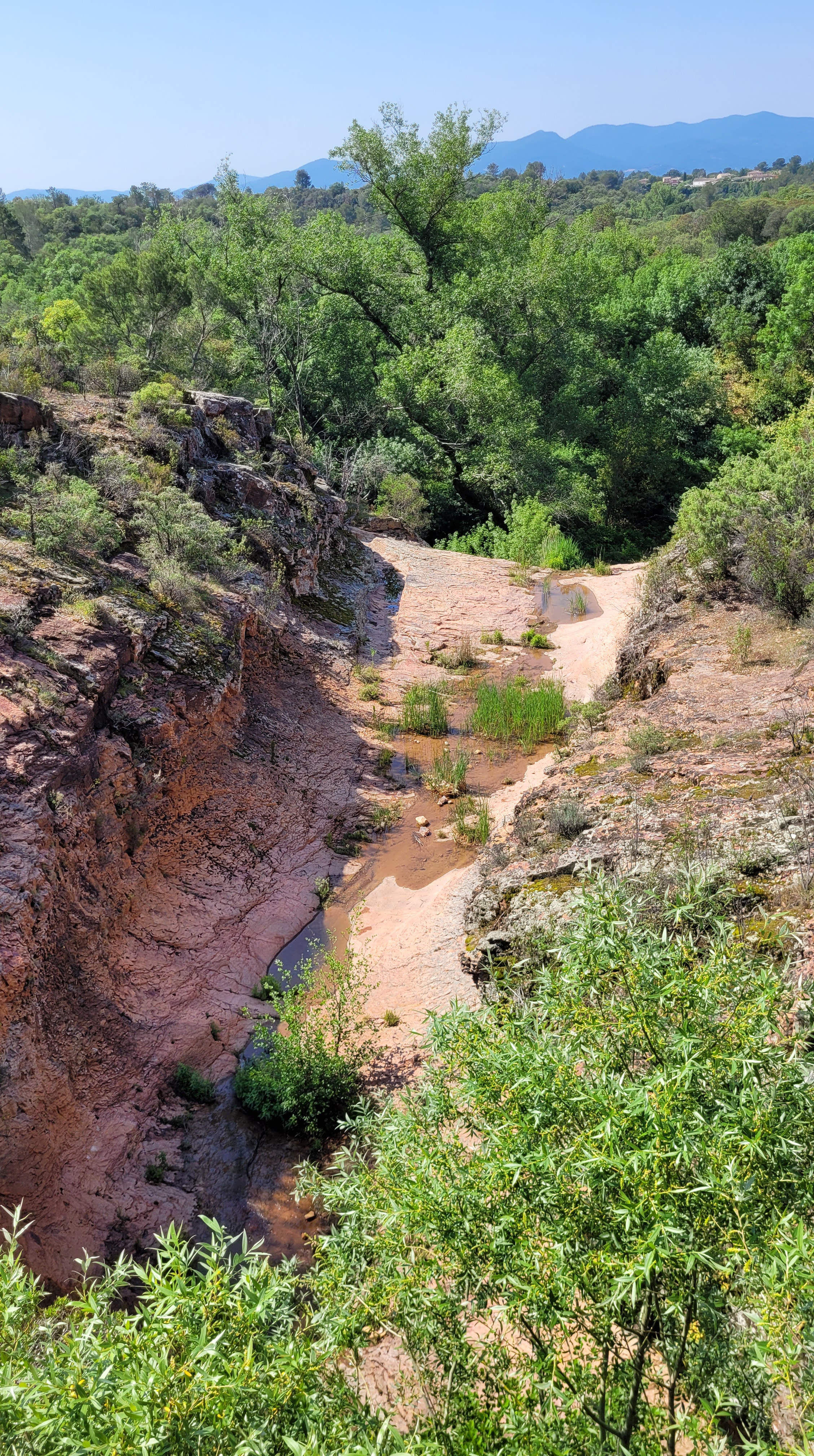 En bas de la pente, dans un chaos de rochers tapissés de lierre, on finit par distinguer le Blavet, rivière temporaire de 14 kilomètres. Selon les années, tel un oued, on peut l’entendre couler jusqu’au début de l’été parmi les aulnes et les frênes et sentir son agréable fraîcheur. Quelques centaines de mètres plus loin, le sentier traverse le cours d’eau et nous dévoile, derrière les troncs graciles des pins en quête de lumière, les flamboyants escarpements qui attirent les grimpeurs avec leurs 80 mètres de hauteur. Sur le massif au nord-ouest des gorges, plusieurs meulières ont fonctionné de l’Antiquité jusqu’au XVIIIe siècle, exploitant la roche mère de l’Esterel, dure et abrasive, pour produire des meules pour les moulins à huile ou à farine. Peu après la pierre égarée, on quitte le GR51 pour gravir le sentier qui se faufile entre les rochers, avec la sensation de léviter au-dessus de la canopée. Des cistes distillent leur parfum suave et une chaleur sèche nous accueille. C’est le moment de contempler les gorges une dernière fois, depuis un point de vue vertigineux, et de reconnaître à ce site spectaculaire des airs de petit Colorado varois.