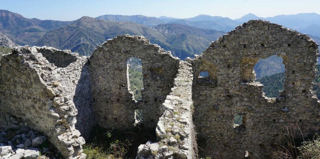 Programme de la sortie n° 292: la Cime de Rocca Sparviera au départ de l’Engarvin, au dessus de Coaraze, sortie précédemment effectuée le 17 Juin 2019. Hameau fantôme aux murailles en lambeaux, Rocca Sparvièra évoque plus une lamaserie du Tibet qu’un village des Alpes-Maritimes. Rocca Sparvièra ou « Rocher des Eperviers », village en ruine juché à 1100 mètres d’altitude il surplombe la vallée du Paillon à l’Est (torrent fougueux mais souvent paisible, il baigne rarement Nice car la plupart du temps il est asséché) et les gorges de la Vésubie à l’Ouest, lieu de désolation depuis la tempête historique.