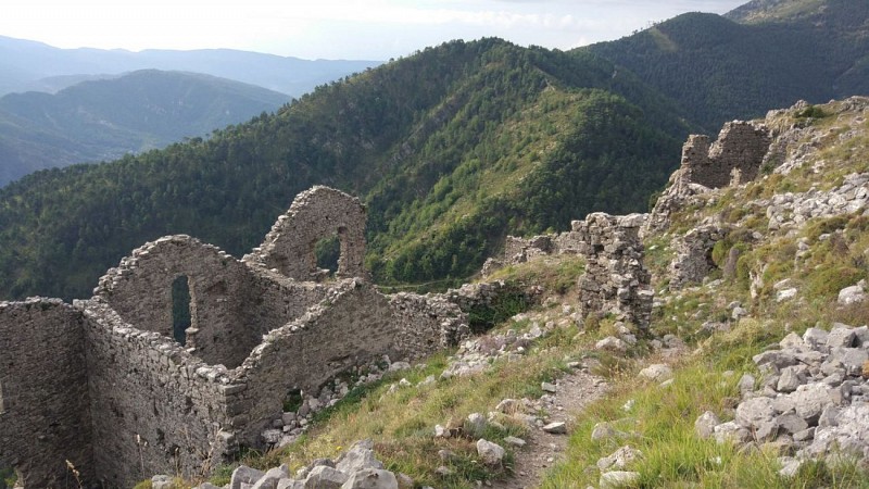 Une balade pas difficile et qui offre depuis un austère promontoire un joli panorama sur les vallées du Paillon et de la Vésubie, avec en point d’orgue la découverte des ruines d’un ancien village accroché à son éperon rocheux. Il fut une époque où ce lieu reculé, maintenant loin des hommes et un peu hors du temps, comptait plus de 300 âmes… Mais en 1357, la Reine Jeanne (pour des raisons que vous trouverez dans les liens en fin de topo) lança une malédiction sur le village : « Roche sanglante, roche maligne, un jour viendra où sur tes ruines ne chantera plus ni le coq ni la poule ». Peste, tremblements de terre entre autres ont vidé les lieux, laissant un village fantôme en 1723.