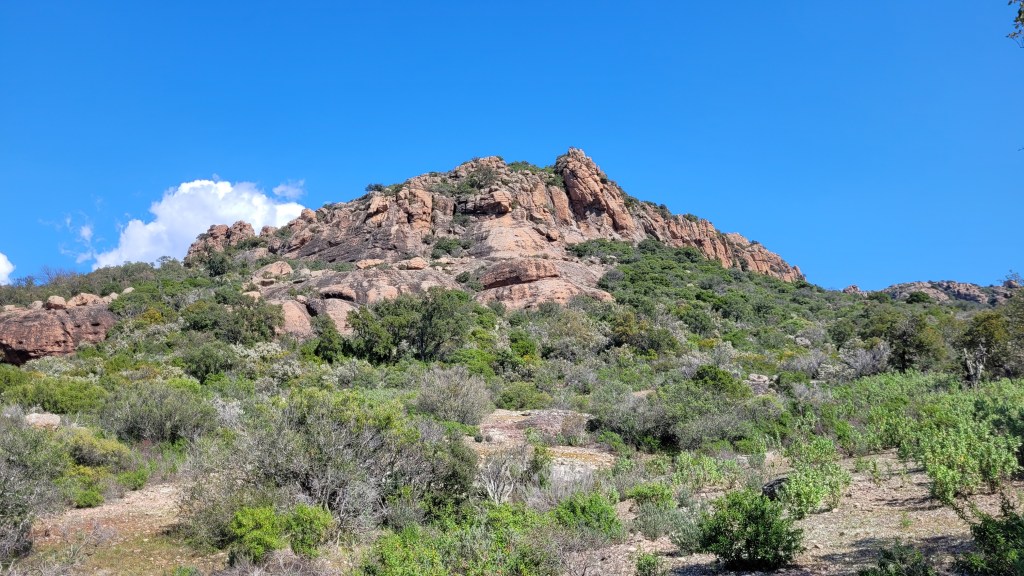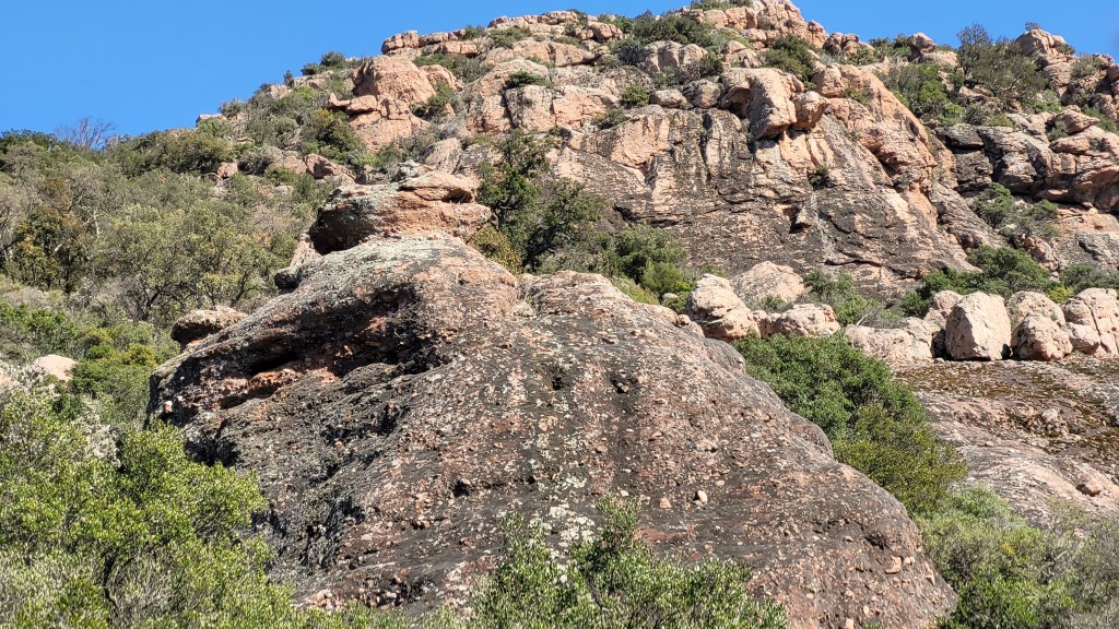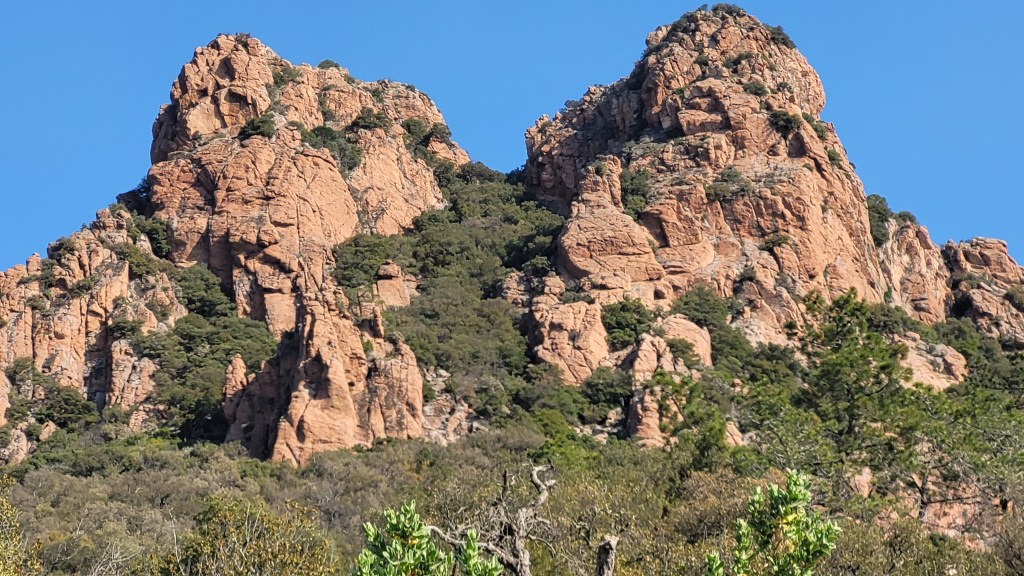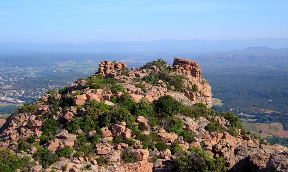 La couleur de la roche, constituée de grès rougeâtres, contraste avec le vert du maquis alentour. Le relief est composé de crêtes déchiquetées et falaises abruptes. L’érosion y a sculpté et creusé des grottes, agrandi les failles et modelé des colonnes en forme de champignons, comme les Deux Frères. Une des grottes a d’ailleurs été habitée par un ermite du nom de frère Antoine, pendant plus de 50 ans !
